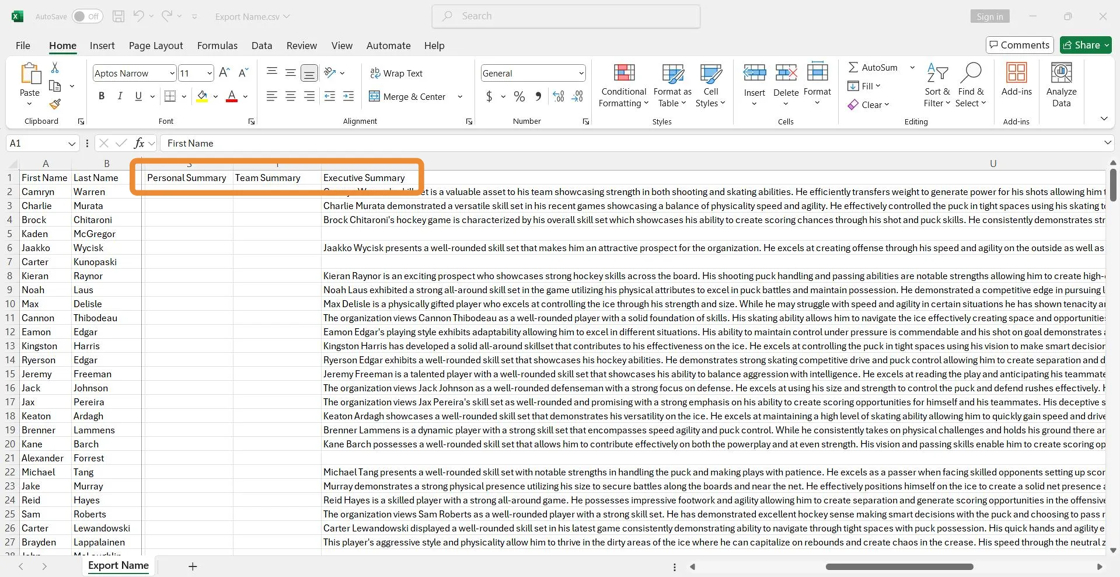 10. Open Exported CSV to See Available PowerPlay AI Personal, Team and Executive Summaries.