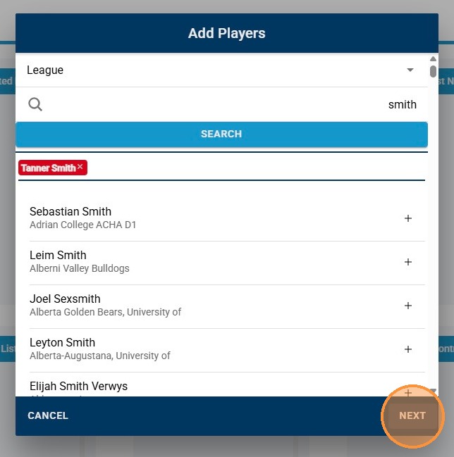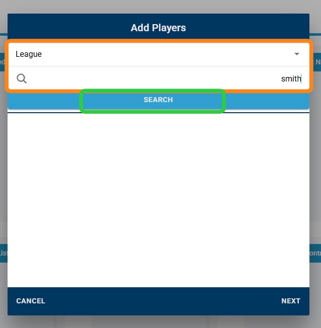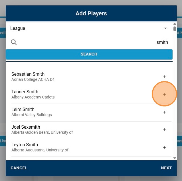 2. Use Either the Screen Bar to Search for Player Name OR Use "League" and "Team" Dropdowns to Find Full League or Team Roster, then Click "Search"
